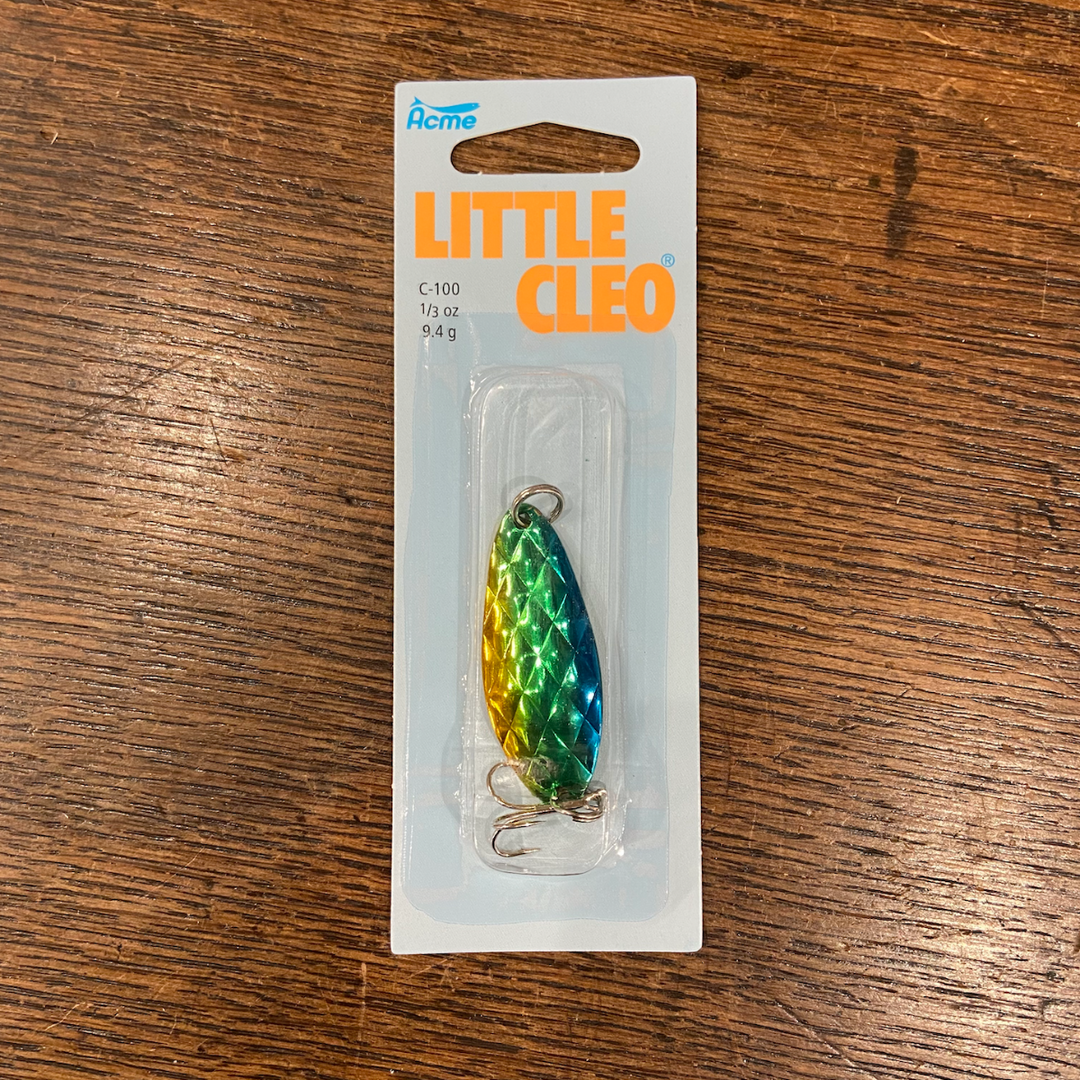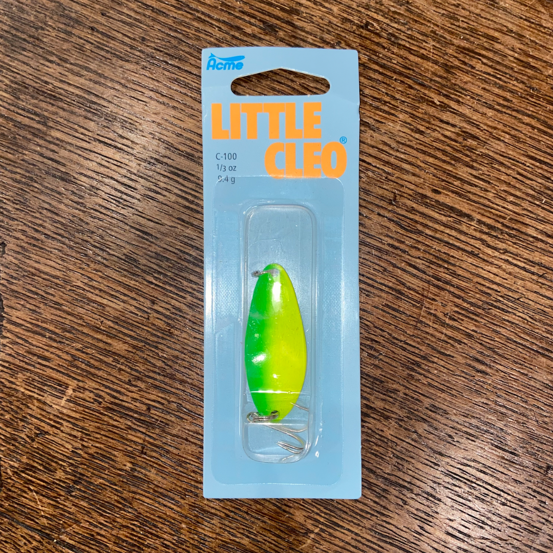 Acme Little Cleo Spoons are very versatile, taking various species of gamefish around the world. Acme Little Cleo Spoons are available in a wide variety of sizes and colors suitable for use on a variety of gamefish, ranging from trout and panfish to stripers, pike, and muskie. The unique hump-backed shape of the Little Cleo results in a seductive, wiggling action as the lure is drawn through the water. The illusion created is one of a baitfish, acting in an erratic, confused manner. This triggers the predatory nature of the gamefish to strike. This appeal to fish explains Little Cleo’s fantastic success as the one lure that takes all gamefish.