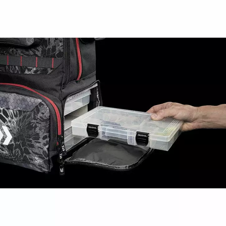 The Tactical Backpack is supported by a ridged non-collapsible frame with a riveted PVC superstructure. The durable framework is cloaked with a robust, double stitched PRIM1 tactical fabric, which also serves up a cool visual factor. Internally, the Tactical Backpack features a 3-utility box stack system, complete with an included trio of Daiwa branded 360 boxes. Throughout, closures are fortified with #10 Delran corrosion resistant zippers.