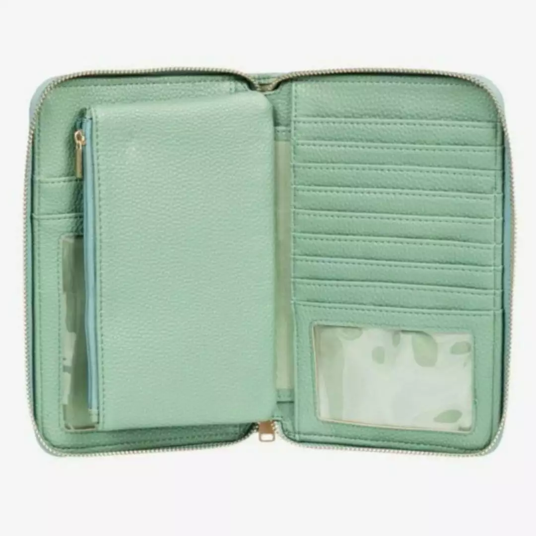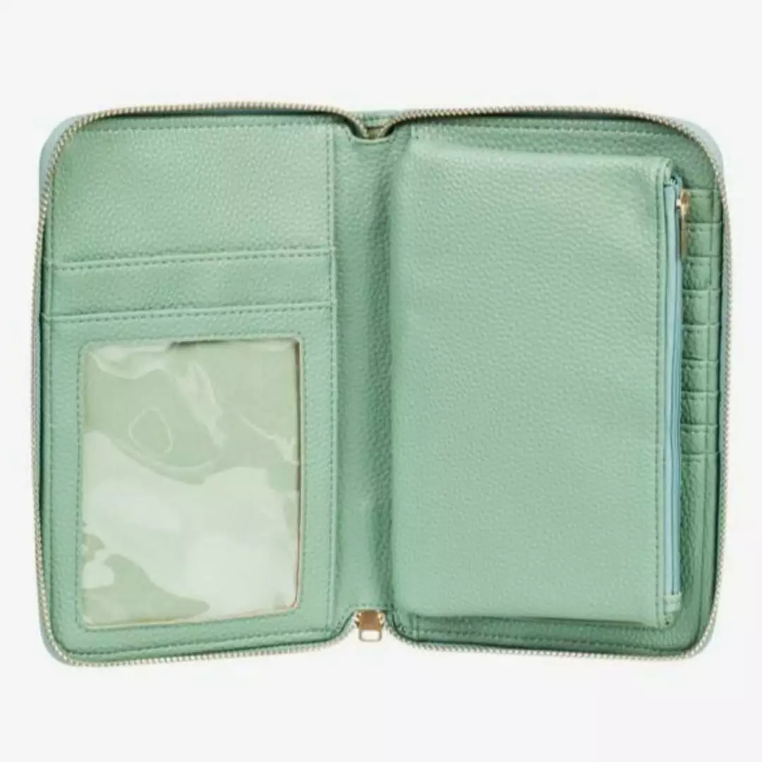 We designed the trendy zip-around Magic Happens wallet so you never leave any essentials at home. An embossed faux leather construction comes in a green sea spray colorway, perfect for year-round use. With plenty of interior storage space, you can carry all of your cards and any cash you might have.