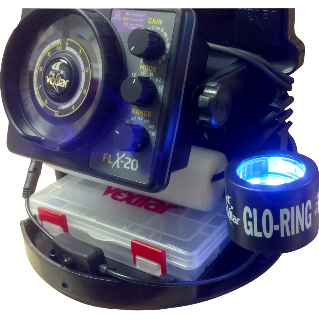 Using special UV LED’s anglers are able to glow a lure treated with glow paint with only one second of exposure inside the powerful GLO-RING light chamber. Powered by your either a direct connection to your Vexilar battery via the quick connect charging cable or it can be fully adapted to get power from any carry case with supplied gator clip adapters. Even a mounting bracket comes with the GLO-RING to install on a Vexilar Genz pack or the wall of your permanent fish house. The GLO-RING can also be used as a rod holder too!